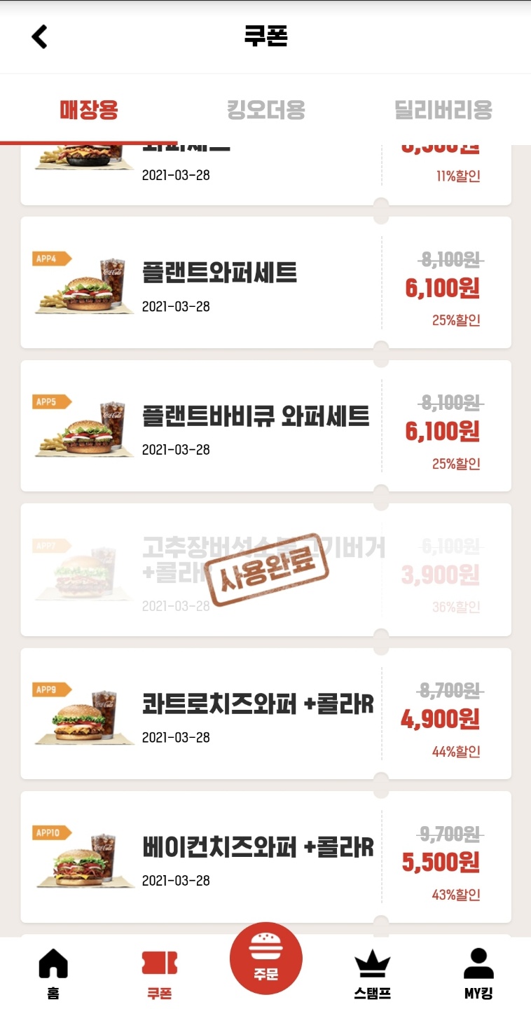 앱 밑에 보시면 홈, 쿠폰, 주문, 스탬프, 마이킹이라고 쓰여있습니다. 그중 쿠폰을 선택해주시구요. 거기서 원하시는 품목을 선택한 뒤에 키오스크 앞으로 가서 선답니다.