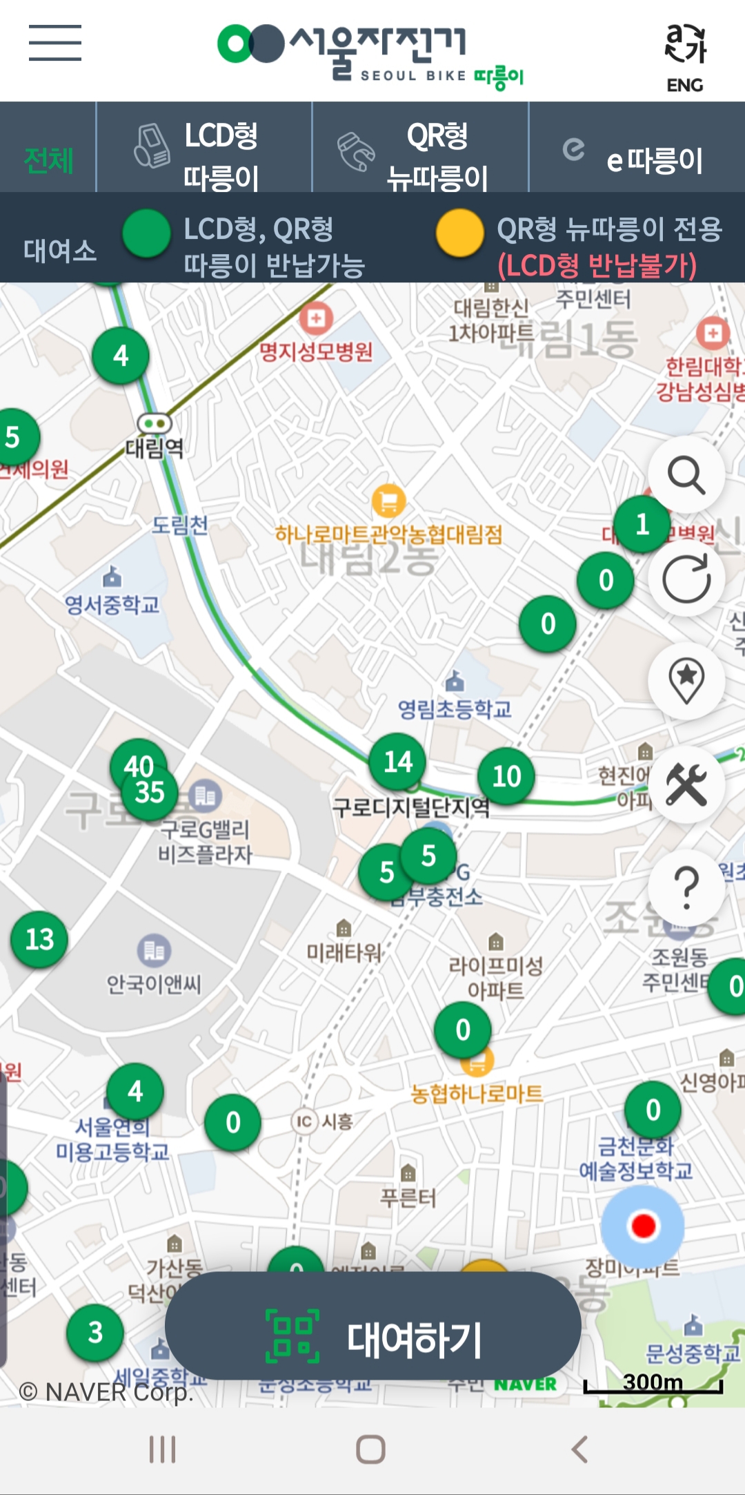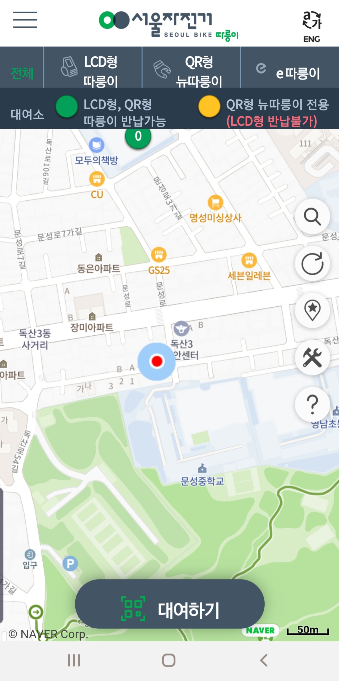현재 자신이 있는 곳에 자전거가 없다면 화면을 축소해서 화면을 이동시켜 보거나 이동하면 자전거 대여소와 남아있는 개수가 나타납니다.