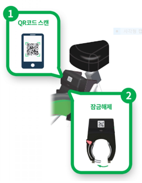자전거 뒤 바퀴 위쪽과 안장 사이에 QR 코드 가 있으니 폰 화면에 대여하기 버튼을 클릭 후 스캔 후 사용합니다.
